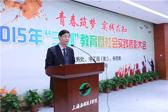表彰大会通过视频回顾总结了我校2015年大学生暑期社会实践的概况,依次表彰了社会实践、学科技能竞赛、“互联网+”大赛、“挑战杯”竞赛各类获奖团队、先进个人、优秀指导教师和优秀组织奖单位。社会实践项目《沪城颂千年文脉,古桥渡传世国风——上海濒危古桥调研》、创新项目《滚筒式分币机》、“互联网+”大赛入围上海赛区作品《MWR(微波测距)定位系统》在大会上进行了项目展示,受到了师生们的好评。