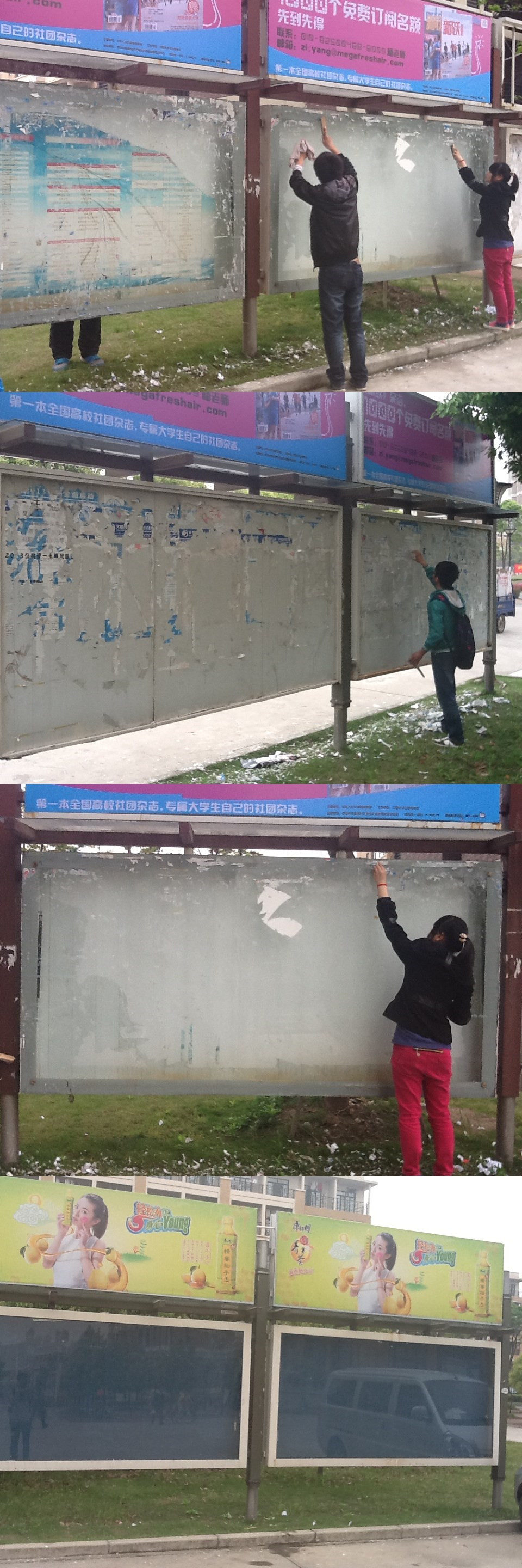 下午,各位参与清洁的同学准时来到了学校的二食堂和16号楼等橱窗展示处,拿出准备好的刷子和水等工具积极行动了起来,对橱窗上的小广告进行了清理。偶尔遇到一些粘贴得特别牢固的小广告,大家也都一遍又一遍耐心地清除干净。