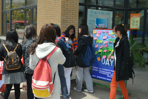 活动以现场播放倡议环保视频的形式向学生们灌输环保的理念。路过的同学纷纷在“保护地球—从身边小事做起”的横幅上留下了自己的签名,以表达自己对环保事业的支持,及为雅安灾后人民的祈福。