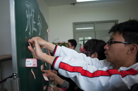 同学们每人心怀祝福,在小卡片上写上自己的祝福,贴在黑板上上。“多难兴邦”“中国加油”“雅安加油”“我们和你们在一起”等等祝福都贴在了祈福树上,也希望我们的祈福能温暖受难者的心。