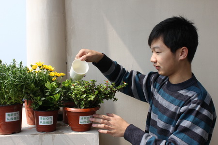 当雾霾天气笼罩,两会热议空气质量和环境污染问题的时候,我们大学生除了关注两会外,更应以实际行动从自己做起、从身边做起,将我们的“校园”、宿舍“家园”和教室“学园”变得清新整洁、生机盎然。于是,由电气学院学生会发起的主题为“添一抹绿色,建美丽校园;树环保理念,爱共同家园”的绿色校园行系列活动在植树节当天拉开了帷幕。同学们把贴有“清新空气从我做起”的盆栽放进了寝室、宿舍楼的大厅和党团活动室,希望小小的盆栽不仅能给宿舍家园添一抹绿色、一眼清新,把校园装点得更美丽,更承载着大大的环保理念,常伴你我身边,时刻爱护我们共同的家园。
