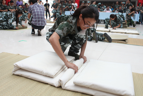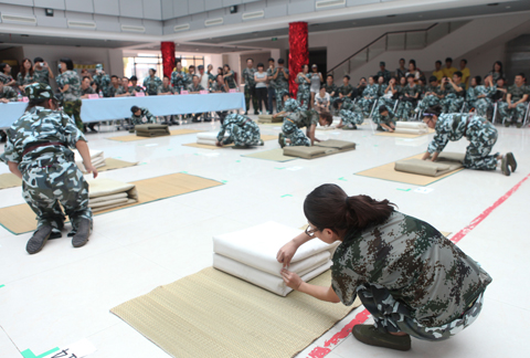 军训,培养了学生军人素质,也反映了我校学生的精神风貌。此次叠被子比赛丰富了大学生军训文化生活,调动了学生参训的积极性,营造了良好的军训氛围。同学们学习到了教官们一丝不苟的生活作风和训练中严厉的教导,为今后的学习和生活获得更大的收获! (校团委 周青)