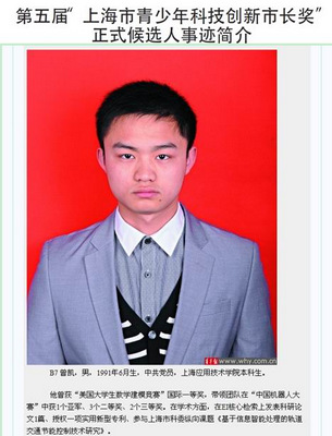 获悉,我校工程创新学院09级学生曾凯同学日前喜获第五届“上海市青少年科技创新市长奖”正式候选人提名。