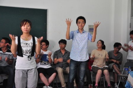 活动开始前,志愿者们紧锣密鼓地布置会场、准备活动道具、安排各人员就位。虽然特教班同学听不到声音,但是大家报以了最热烈的掌声欢迎他们的到来。活动以一段手语比赛开始,志愿者们认真地向特教班小老师学习,还不时向周围的特教班同学请教,想不到看起来简单的几个比划有这么丰富的含义。教授动作完成后便是紧张激烈但笑料十足的比赛了,各组队员摩拳擦掌,跃跃欲试。一个个组轮番选题比赛手语,有的准确无误、有的动作搞笑。当然第一个游戏只是拉开了活动的序幕,第二个活动你做我猜,更是将活动推向了一个高潮,观众在特教班同学手语的描述下猜出他表达的含义,有的猜得南辕北辙,有的不知道表达了什么,会场内不时阵阵欢笑声,感慨原来手语是这般深奥。接下来是竹筷传圆环,同样是既扣人心弦,又搞笑十足。活动以一段手语视频《隐形的翅膀》结束,希望特教班的同学能继续坚强地追求自己的梦想,笑对生活!也借此机会希望更多的志愿者关注他们,加入到我们的行列。活动结束后召开了首次全员队长会议,会上各队介绍了自身的情况,各队进行了更深层次的交流。总队长张帅总结并提出改进建议和对各队伍的期许。