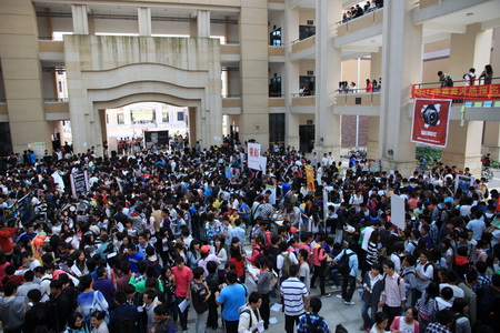 16时30分,招新活动正式开始。展板横幅彩色旗,引人入胜;劲歌热舞展才艺,花样百出。大红色篆体“创业”招牌下创业社人员西装革履,激情演说;天文社摆出专业器材,现场展示;留学社社长兔八哥卡通装扮显可爱:桌游社三国杀角色扮演展豪情。同学们将他们团团围住,有拍照留影,有现场报名。在大厅另一侧,溢彩社统一着装,现场演示相机拍摄;绿色未来同盟社极力推广其绿色理念,人气爆满;文博书画社,挥文舞墨显才气;服饰文化社,靓装渐欲迷人眼。值得一提的是,器乐社、37°2电影社指导老师陈浩时也来到现场,亲自指导招新工作。