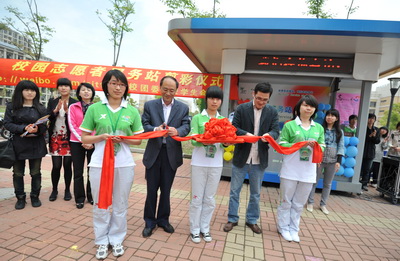 5月4日中午,上海应用技术学院校园志愿者服务站启动剪彩仪式在奉贤校区志愿者服务亭外举行,校党委副书记、副院长康年,学工部部长应邀出席并为志愿者服务站剪彩。校团委书记、团干部及15支志愿者分队队员近百人参加了剪彩仪式。