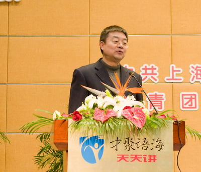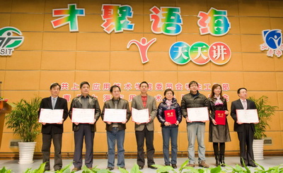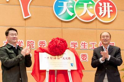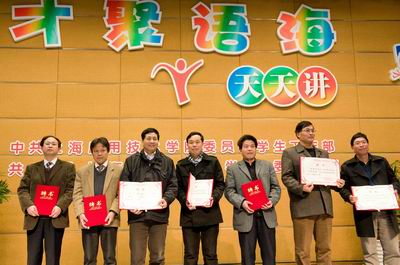 在激扬的音乐声中,校长卢冠忠为“天天讲”讲师团成员颁发聘书,并宣布上海应用技术学院“才聚语海”“天天讲”活动正式启动。团市委副书记夏科家和校党委副书记、副院长康年一起为“天天讲”活动揭牌,并分别致辞。夏书记的致辞幽默风趣,他阐述了自己在复旦念书时就已经对讲座产生了浓厚的感情,也希望能够通过”天天讲”活动,让我校学生也对讲座产生浓厚的兴趣。康书记在致辞中指出,“天天讲”活动的目的就是为了帮助学生用科学的世界观、人生观、价值观构筑远大的理想信念和健康的精神追求,同时表达了校党委对”天天讲”活动的支持,希望通过这次的”天天讲”,让我校学生能够在思想上受到熏陶。在全场热烈的掌声中,启动仪式完美落幕。
