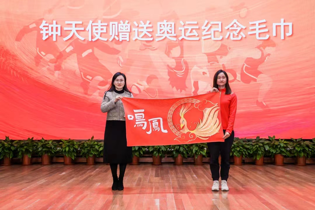 随后,钟天使将奥运同款鸣凤毛巾赠予学校。王瑛将我校学生创作的非遗漆艺作品《荷韵》赠予钟天使。
