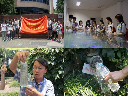 来到上海闵行污处理水厂,负责人范主任热情接待队伍一行。首先,我们参观了上海闵行污水处理厂的中水处理模型。范主任就中水处理专业知识、生态基础工程情况等进行了简要介绍,期间队员们认真的记着笔记,对疑惑之处不断询问。随后,我们在技术科的专业指导人员的带领下,先后参观了三槽式氧化沟、中水提升泵房、混凝池、无阀滤池、中水清水池、中水出水泵房、中水水塔,最后是整个中水处理流程演示。小队成员了解到众多中水处理设备以及它们的工作原理,目睹了中水一步步净化的过程,并收集了一瓶稀有的中水。在短短的一个小时中,我们了解了中水处理的大致流程,了解了对如今城市污水的现状,更是对从事环保事业、每日与发臭的污水打交道的污水处理员多一份尊重。