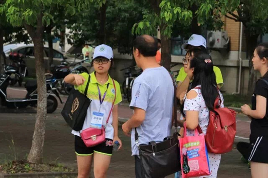 志愿者曾彩玲同学是校内驱车停车点岗位的负责人,连续两天,每天超8小时的工作,带领着14名同学,分布在校内7个段驱车停车点岗位。作为组长的她,当第一辆新生大巴停靠下车点时,她第一时间上前,满怀热情、微笑着解答学生和家长们提出的各种问题,手上还不停的协助他们搬运物资。曾彩玲笑着说到:虽然迎着烈日,流淌着疲惫却又幸福的汗水;虽然每天需要解答很多问题,