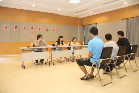 2012年6月29日下午,由校团委主办、青年志愿者服务总队承办的2012届迎新志愿者招募面试在学生活动中心103、216室进行,学工部、校团委老师及志愿者总队学生代表担任评委。