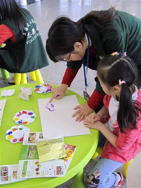 此次生态志愿者的主要分为四个部分:专类园的讲解、园内向导、手绘指导、展区标本采集。生态志愿者在菊花和向日葵两个专类园为游客做了精彩的讲解。生态志愿者发挥绘画才能,手把手地教有课绘画折纸,受到一致好评。凭借专业优势,部分志愿者记录植物的全称、种属,制成标本摆放展区为游客观看学习。而在温室巡视和园内向导的志愿者们,既要阻止游客的不文明行为,也要为游客提供指引。在整个服务过程中,虽然大家的脸上都挂着汗珠,可是笑容从不曾退去。