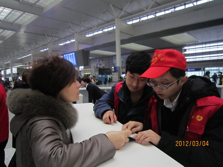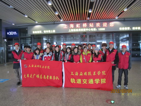 2012年3月4日中午,上海应用技术学院轨道交通学院“雷厉锋行”——学雷锋系列活动的志愿者们奔赴上海虹桥火车站,开展“服务虹桥”的志愿服务,共23名通号技术、车辆工程、轨道工程、交通工程专业学生参加了此次活动。