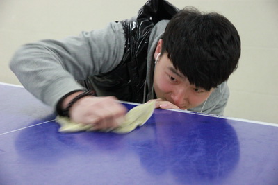 晚6点,同学们自带上劳动工具,开始清洁运动场地的活动:他们认真擦拭每一张乒乓球台;在羽毛球场,用胶带将已经磨损严重的地标重新粘贴;同时,大家还贴心地写下了醒目的标语,提醒在运动场地活动的同学注意相关的安全知识。